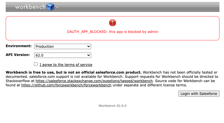 If a user does not have the 'Use Any API Client' permission, then he will get an exception when trying to access the Salesforce APIs. The following error is shown in Workbench: