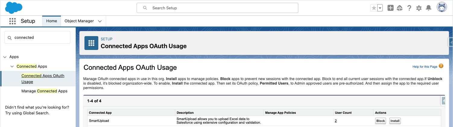 Now in Setup navigate to Connected Apps OAuth Usage. Since you have already installed and used SmartUpload as an administrator, SmartUpload should be visible in the list. Click on the 'Install' button next to it: